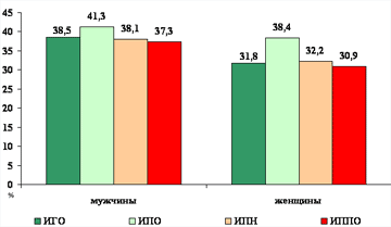 Распределение значений Индекса “ПРОИЗВОЛА ПРАВООХРАНИТЕЛЬНЫХ ОРГАНОВ” (ИППО) и его составляющих по полу. % от числа опрошенных