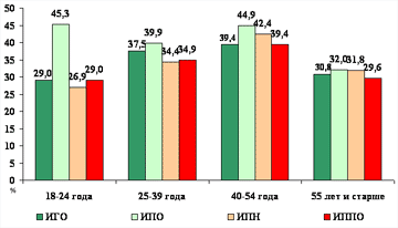 Распределение значений Индекса “ПРОИЗВОЛА ПРАВООХРАНИТЕЛЬНЫХ ОРГАНОВ” (ИППО) и его составляющих по возрасту. % от числа опрошенных