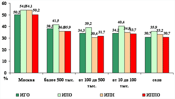 Распределение значения Индекса “ПРОИЗВОЛА ПРАВООХРАНИТЕЛЬНЫХ ОРГАНОВ” (ИППО) и его составляющих по типу населенного пункта. % от числа опрошенных