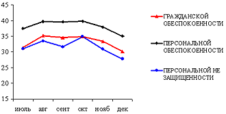 Значения ИНДЕКСОВ ГРАЖДАНСКОЙ, И ПЕРСОНАЛЬНОЙ ОБЕСПОКОЕННОСТИ, ПЕРСОНАЛЬНОЙ НЕ ЗАЩИЩЕННОСТИ, июль-ноябрь 2004 г.