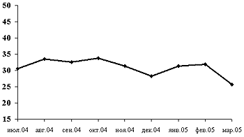 Значения индекса ПРОИЗВОЛА ПРАВООХРАНИТЕЛЬНЫХ ОРГАНОВ, июль 2004 г. - март 2005 г.