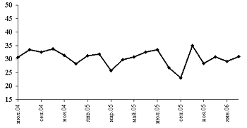 | Опросы, проведенные по репрезентативным выборкам населения России, 1600 человек в возрасте 18 лет и старше | 2005, май | 2005, июнь | 2005, июль | 2005, август | 2005, сентябрь | 2005, октябрь | 2005, ноябрь | 2005, декабрь | 2006, январь | 2006, февраль |